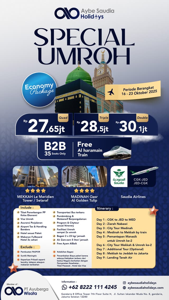 - Paket Umroh Aybe Saudia Holiday menggunakan asumsi Kurs Maksimal 17.000 dan SAR 4500, jika ada kenaikan kurs yang signifikan, maka harga paket akan menyesuaikan